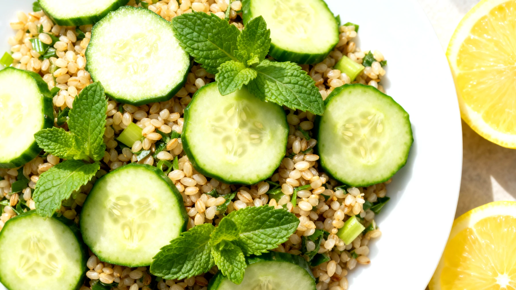 Ein guter Salat ist mehr als die Summe seiner Teile. Bei diesem Rezept verstärken sich die einzelnen Komponenten in ihrer Wirkung gegenseitig. Die Gurke besteht größtenteils aus Wasser und bringt zusätzlich harntreibende Eigenschaften mit. Frische Minze unterstützt die Verdauung und verleiht dem Gericht eine erfrischende Note, die gerade nach dem Sport besonders angenehm ist. Die Zitrone steuert nicht nur Vitamin C bei, sondern rundet die entwässernde Wirkung des Gerichts ab.