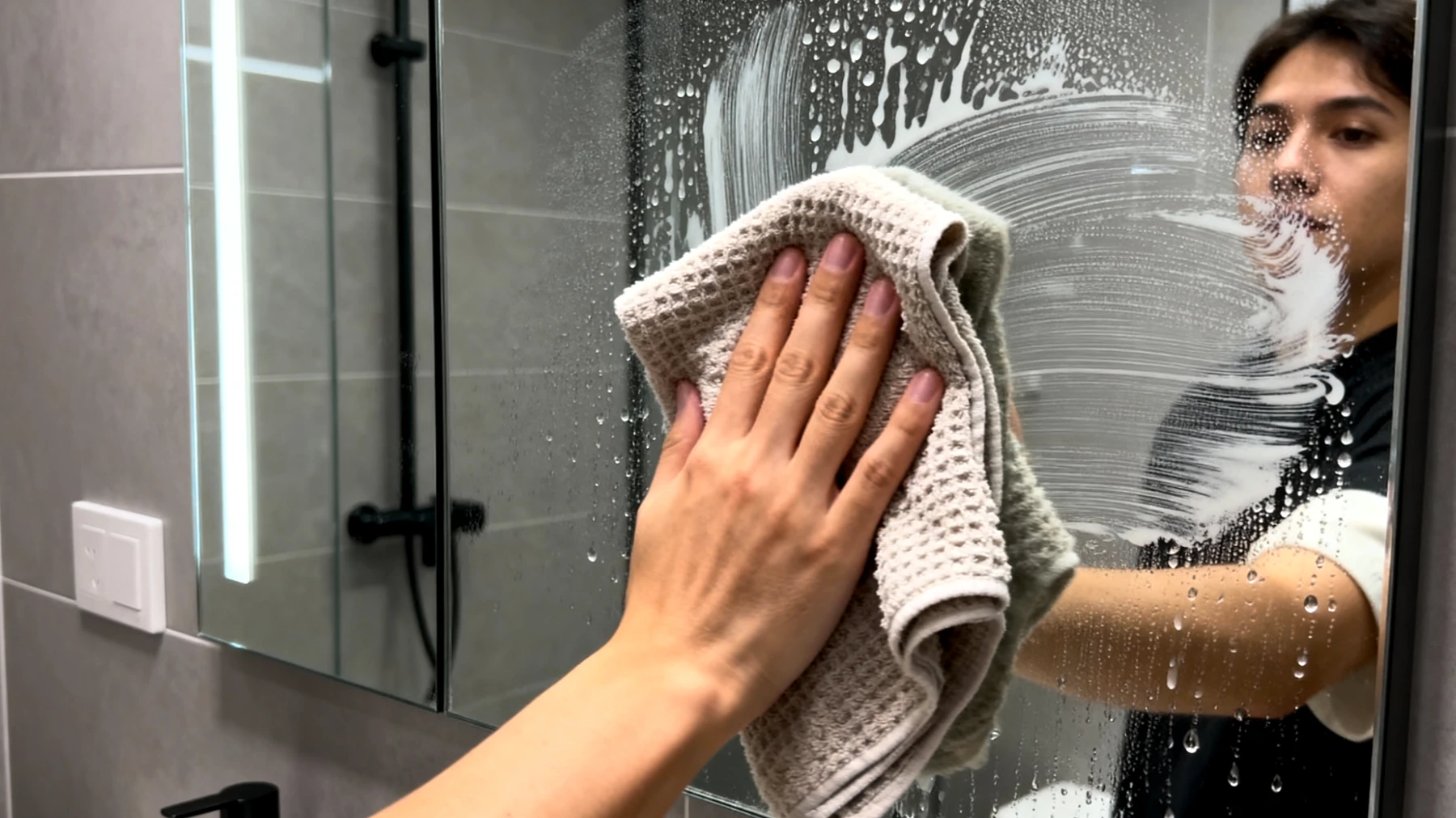 Unter normalen Bedingungen bilden sich auf dem Spiegel unzählige kleine Tröpfchen, weil Wasser auf sauberem Glas eine relativ hohe Oberflächenspannung zeigt. Diese Spannung führt dazu, dass das Wasser kugelförmige Tropfen bildet – genau jene Tropfen, die das Licht streuen und den Nebel-Effekt erzeugen. Die theoretische Überlegung bei der Anwendung von Rasierschaum ist, dass eine gleichmäßig verteilte und nach kurzem Einwirken sanft abgewischte Schicht einen mikroskopisch feinen Film hinterlässt.